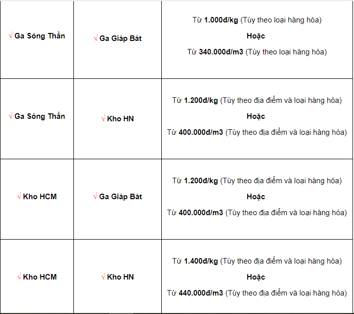 Giá cước dịch vụ gửi hàng Nam Bắc